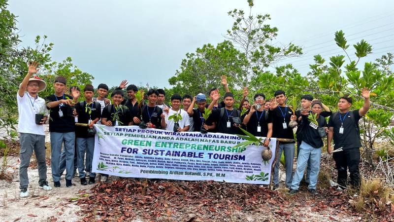 Tidak hanya berorientasi pada profit, pembelajaran ini juga menekankan aspek restorasi lingkungan. Hal tersebut diwujudkan melalui penggunaan bahan baku lokal, kemasan ramah lingkungan, hingga program pembelian produk yang disertai pemberian bibit tanaman. Program ini bahkan dilengkapi dengan kegiatan penanaman langsung di area bekas tambang sebagai bentuk kontribusi nyata terhadap pemulihan lingkungan.